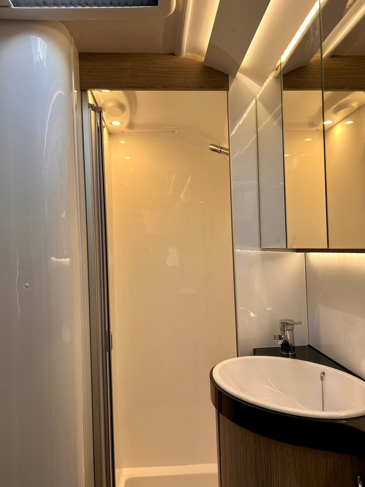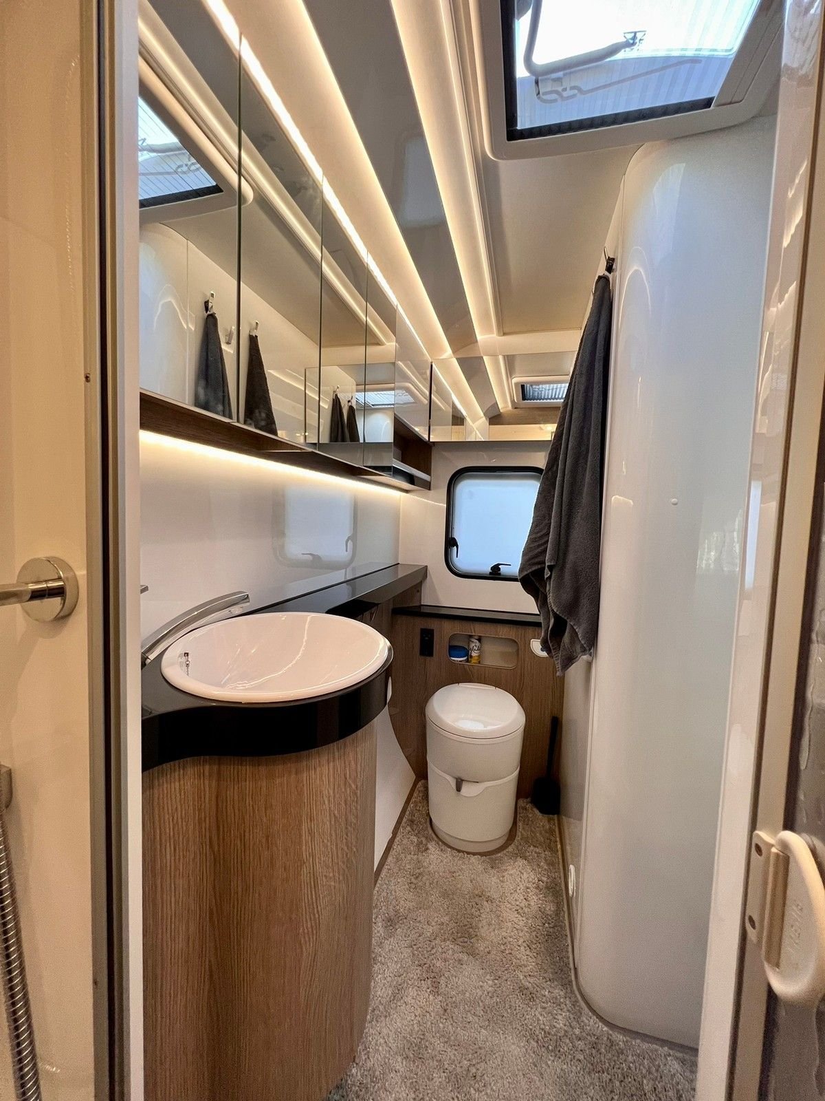 Salle de bain à l’arrière sur toute la largeur de la caravane.