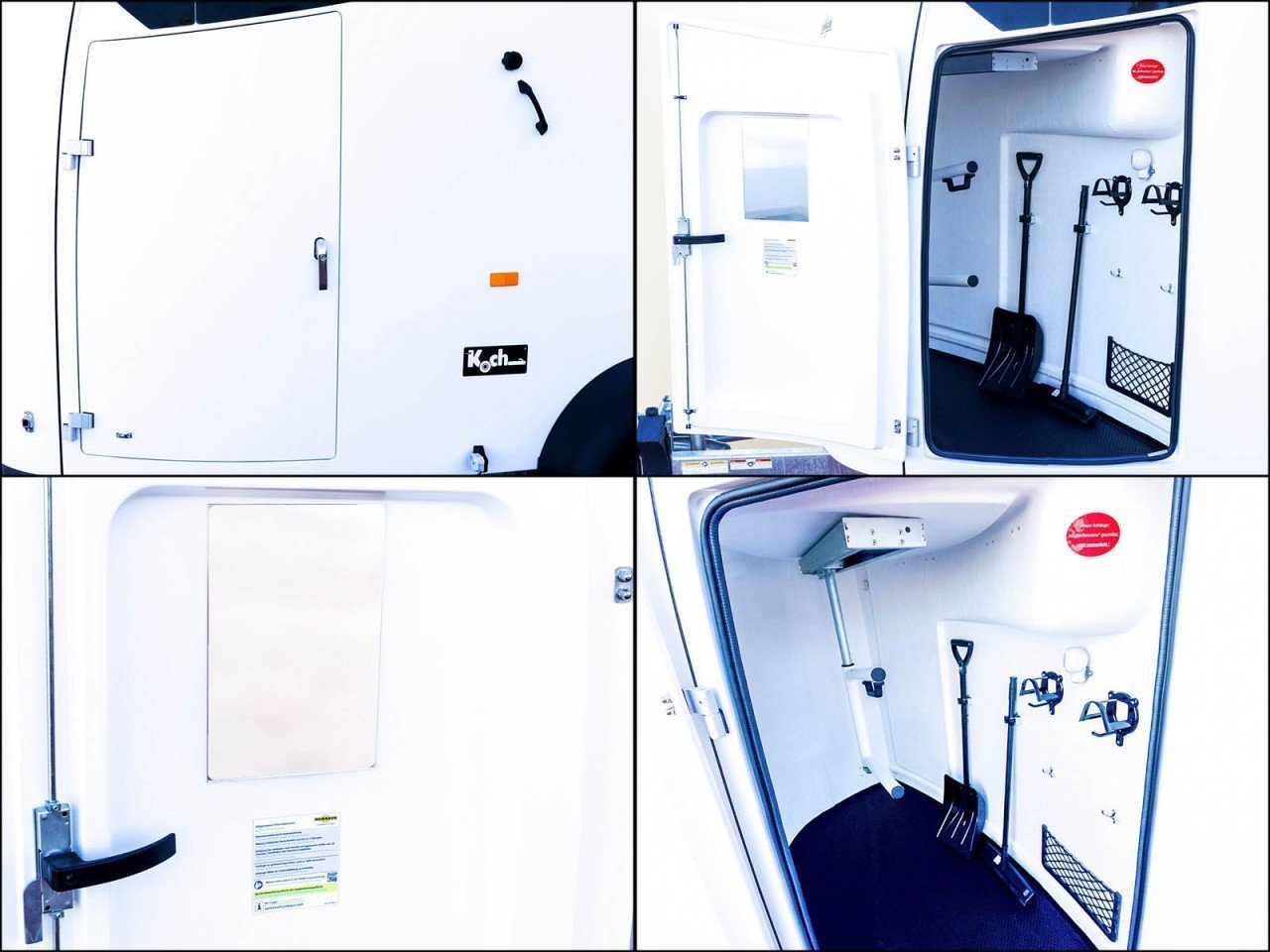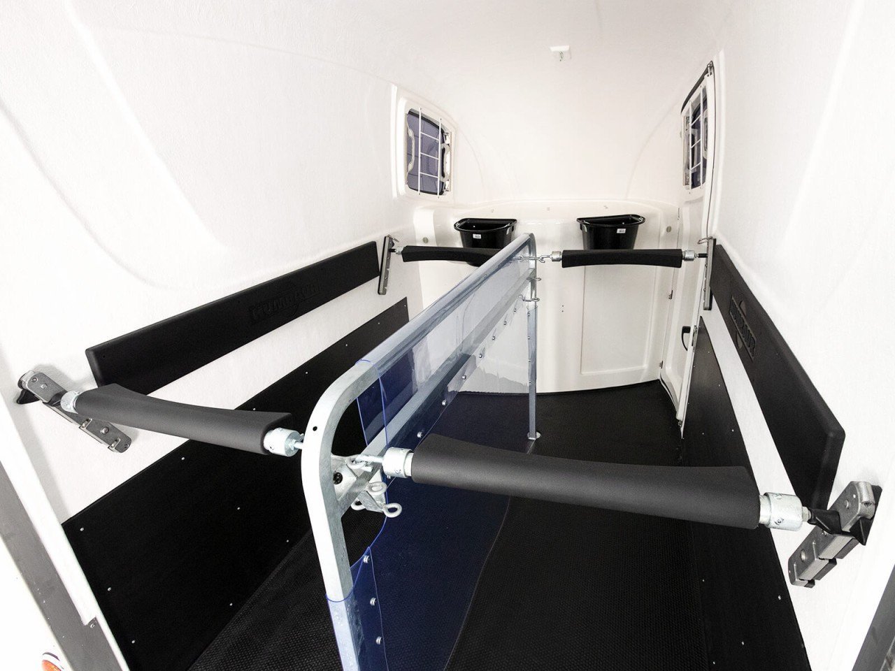 Toujours frais devant : grâce à la fenêtre avant réglable dans cinq directions, il n’y a pas d’air épais dans le XANTHOS MAXIMUS . Un déflecteur d’air installé de série et une trappe de toit pouvant être installée ultérieurement sur demande assurent également un apport d’air frais sans courant d’air. Mais le confort n’est pas la seule priorité chez Humbaur : la cloison verrouillable, les parois latérales en poly massif et le profilé de cadre galvanisé à chaud font du XANTHOS MAXIMUS un van pour chevaux stable et robuste pour les exigences les plus élevées.